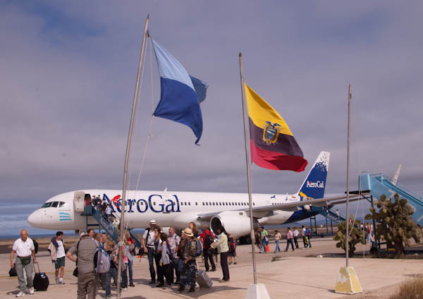 The flight to Baltra was about 90 minutes long on an AeroGal (Aerolineas Galápagos) 737, and featured a second breakfast opportunity. Just before landing, they came through the plane, opened the overhead bins, and sprayed a mild insecticide to protect the fragile environment of the Islands.