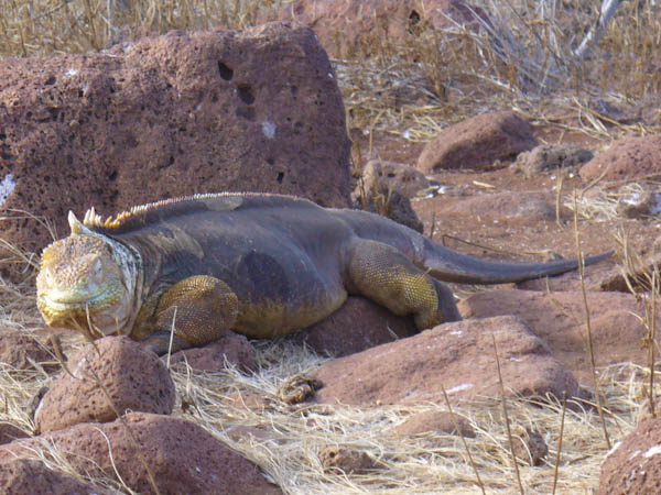 Baltra itself is a barren place. The island, used as a military base during World War II, seems to consist mostly of a small airport, a port, and a few small military facilities. The airport is surrounded by a surprising number of small souvenir stalls. We took a bus to the port, and were greeted by a marine iguana, a sea lion, and a number of colorful crabs which are a taste of things to come.