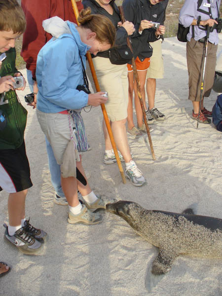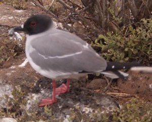 We got lots of pictures of blue-footed boobies, frigate birds (including that crazy red pouch the male uses when trying to attract a mate), both land and marine iguanas, sea lions and their young (one of which sniffed Celeste to see if she was its mother), and the endemic swallow-tailed gull. All in the course of a 1 1/2 mile walk. It’s true, they aren’t afraid of people, but it’s important to respect their space, which we tried to do.
