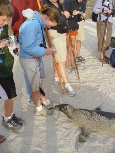 We took Zodiac boats to reach the Endeavour. After being led to our cabins (small and cozy but efficient), we attended a series of introductory briefings interspersed with snacks and lunch. Mid-afternoon we finally boarded Zodiac boats for our first hike, on the tiny island of N. Seymour. As we boarded the Zodiac boat, one of the naturalists handed Celeste a “scavenger hunt” list of things to look for on the island. This was one of the many things they do to help keep the kids engaged.