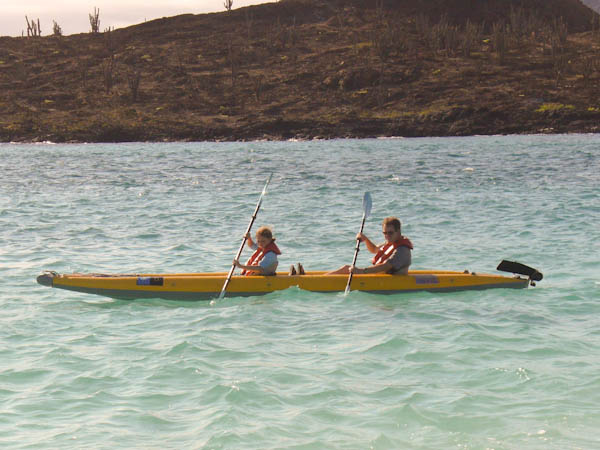 After lunch there was a Darwin lecture for those interested and a Galápagos game for the kids, which Celeste did quite well on. Later, Celeste and I went out kayaking while Kenna went to the beach to watch. We didn’t get to see much wildlife from the kayak (as expected) but got some good exercise and practice paddling around. When we were returning the kayak, one of the other kayaks had come loose and we caught it, but were told to leave it alone; it seems that guests aren’t allowed to help with this sort of thing. On the Zodiac boat returning to the ship, we took a short detour and saw a penguin standing on a cliff in a small inlet. It was our first clear sighting of the Galápagos Penguin.