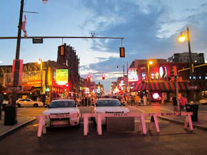 We then took a tram to Mud Island River Park and the Mississippi River Museum. The museum itself covered many aspects of local history, including the Civil War and development of Memphis as a jazz music capital. But we were particularly taken with the exhibit outside: a huge topographic scale model of the lower Mississippi, including bridges and cities. It gave us even more of a feel for the river. We wished we had more time to read the interpretive signs talking about floods, changes in the river’s path, and events like the great 1811 New Madrid earthquake. But we had to catch the last tram back to our hotel. Dinner was at Rendezvous, which is apparently the definitive place for Memphis barbecue, downtown at least. After dinner we walked down to Beale Street, the music district, to find a huge “block party”: the streets were closed to cars, pedestrians walked everywhere, and several bands were playing. We were cautioned (about 8:30 pm) by the police monitoring the street that Celeste would need to leave by 11 pm (no problem!). It was a fun and lively party while we’re there, and probably got a good deal more crowded and lively later.We finished the evening with a ride on one of Memphis’s historic trolleys. It was enjoyable, but we couldn’t see much because it was dark by then. Still it was quite a bargain for $1 each.