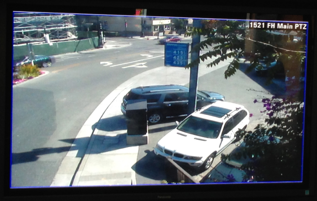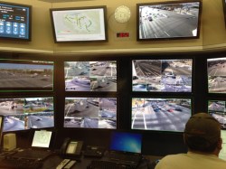 After the briefing, we went next door into the control room itself. It looked like you might expect: lots of screens on the walls showing the status of various intersections. They also had satellite TV weather and news feeds to be able to anticipate and respond to external factors. They can view groups of cameras at any of the intersection, or get a large view of a single camera as needed.