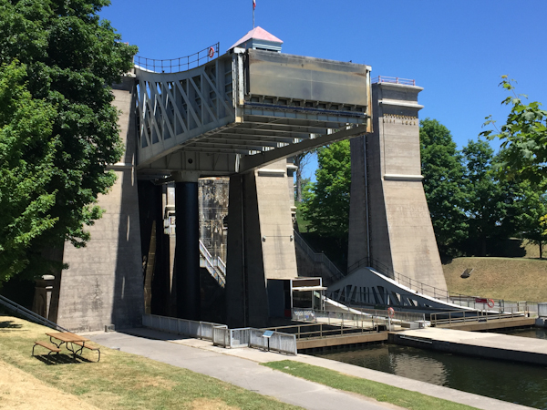 We got a relatively early start from Ottawa. One wrong turn coming out of the hotel, coupled with nearby construction work, made our departure unexpectedly challenging but we found our way. Once we got out of metropolitan Ottawa, the surroundings were quite rural; it appeared that much of the area is wetlands. We stopped in Peterborough, the largest city in the area, to see a notable lift lock, one of two in North America and the largest in the world. The Peterborough lift lock is part of the Trent-Severn Waterway system, which runs through much of this area, extending from Lake Ontario to Georgian Bay off Lake Huron. We continued through Peterborough and grabbed some lunch along the way. Traffic was quite heavy, probably because tomorrow is Canada Day.