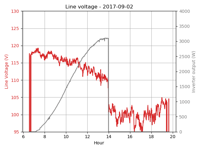 My data are in a MySQL database that I can query easily. So asked it how many days there have been where the line voltage went below 110 VAC (giving PG&E some margin here) and the solar inverter was fully operating. There were 37 such days, including very brief voltage dips (<10 minutes) up to over 5 hours undervoltage on September 2, 2017. The line voltage that day looked like this: