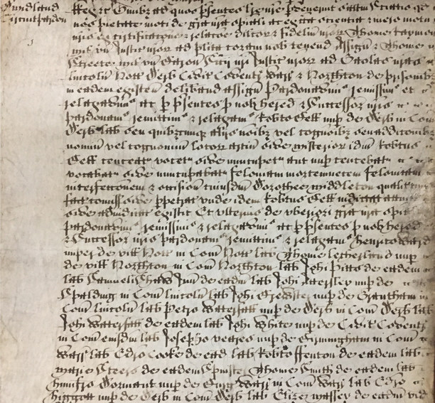 Know that we motivated purely by our pity, of our especial grace and knowledge of the matter by the certification and information of our beloved and faithful Thomas Raymond, knight, one of our Justices assigned for Pleas to be held before us, and Thomas Streete, knight, one of the Lords Justices of our Exchequer, assigned for Gaol Delivery of our Gaols in Lincolnshire, Nottinghamshire, Derbyshire, the City of Coventry, Warwickshire and Northamptonshire, for prisoners being in the same, have pardoned, forgiven and released and by these presents for ourselves, our heirs and successors, do pardon, forgive and release, Robert Sell late of Derby in the County of Derbyshire, labourer, by whatsoever other names or surnames or additional names or nicknames of places, arts or mysteries, the same Robert Sell may be listed, called, or known, or was lately listed, called or known, or used to be listed, called or known, the felony of murder, the felony of killing and slaying of a certain Dorothy Middleton however done, committed or perpetrated, for which the same Robert Sell stands indicted, attainted or judged. And furthermore, out of our more abundant special grace, we have pardoned, forgiven, and released and by these presents for ourselves our heirs and successors we do pardon, forgive and release Henry Ward late of the town of Nottingham in the County of Nottinghamshire, labourer, Thomas Letherland, late of the town of Northampton in the County of Northampton, John Pitts of the same place, labourer, Samuel Shaw the younger of the same place, labourer, John Attersley late of Spalding in the county of Lincolnshire, labourer, John Brewster, late of of Grantham in the County of Lincolnshire, labourer, Peter Waterfall late of Derby in the County of Derbyshire, labourer, John Waterfall of the same place, labourer, John White late of the City of Coventry in the County of the same, labourer, Joseph Veares late of Birmingham in the county of Warwickshire, labourer, Edward Cooke of the same place, labourer, Robert Fenton of the same place, labourer, Mary Steers of the same place, spinster, Thomas Smith of the same place, labourer, Humfrey Dormant late of the Borough of Warwick in the county of Warwick, labourer, Edward Higgott late of Derby in the county of Derbyshire, labourer, Eliza Massey of the same place, widow, and Jeremy Rhodes late of Worcester in the County of Worcester, labourer, or by whatsoever other names or surnames or additional names or surnames or names of places, arts or mysteries, the same Henry Ward, Thomas Letherland, John Pitts, Samuel Shaw, John Attersley, John Brewster, Peter Waterfall, John Waterfall, John White, Joseph Veares, Edward Cooke, Robert Fenton, Mary Steares, Thomas Smith, Humfrey Dormant, Edward Higgott, Eliza Massey and Jeremy Rhodes may be listed, called or known, or were lately listed, called or known, or any of them individually or collectively was or were listed, called or known, of every and every kind of Treason and crimes of Lese Majeste of and concerning clipping, washing, forgeries and other falsehoods of the money of this Kingdom of England or of whatsoever other kingdoms and dominions, and also every and every kind of concealments, treasons, and crimes of lese majeste of and concerning the uttering of coinage being clipped, filed and diminished, by whomsoever (singular or plural) the said coinage was clipped, filed and diminished, and also every and every kind of felonies, homicides, burglaries and trespasses whatsoever by them or any of them done, committed or perpetrated, whereof the same Robert Sell, Henry Ward, Thomas Letherland, John Pitts, Samuel Shaw, John Attersley, John Brewster, Peter Waterfall, John Waterfall, John White, Joseph Veares, Edward Cooke, Robert Fenton, Mary Steares, Thomas Smith, Humfrey Dormant, Edward Higgott, Eliza Massey and Jeremy Rhodes, are indicted, attainted, or judged, or are not indicted, attainted, or judged, and the accessories of each of them, and the escapes made thereupon, and also all and singular the indictments, judgments, fines, condemnations, executions, bodily penalties, imprisonments, punishments, and all other things about these matters, that we or our heirs or successors in any way had, may have or in the future shall have, also Outlawries if pronounced or to be pronounced against them or any of them by reason of these matters, and all and all kinds of lawsuits, pleas, and petitions and demands whatsoever which belong, now or int the future, to us against them or any of them, by reason or occasion of these matters, or of any of them, and we give and grant unto them and unto each of them by these presents our firm peace, so that nevertheless they and each them should stand (singular and plural) righteously in our Court if any anyone if anyone summons them to court concerning these matters or any of them, if they cannot find good and sufficient security for their good behaviour towards us our heirs and successors and all our people, according to the form of a certain Act of Parliament of the Lord Edward the Third late King of England, our ancestor, edited and provided at Westminster in the tenth year of his reign. And furthermore, of our abundant special grace, and certain knowledge and pure motives, for us our heirs and successors, we will and grant that they shall have letters of pardon and all and singular matters contained in the same shall stand well, firmly, validly, sufficiently and effectually in Law and shall be allowed by all and all kinds of our Officers and Servants and those of our heirs and successors, notwithstanding the Statute in the Parliament of the Lord Richard the Second late King of England held at Westminster in the thirteenth year of his reign, or any other Statute, Act, Order or Provision made to the contrary in any manner, provided always that if the said Henry Ward, Thomas Letherland, John Pitts, Samuel Shaw, John Attersley, John Brewster, Peter Waterfall, John Waterfall, John White, 