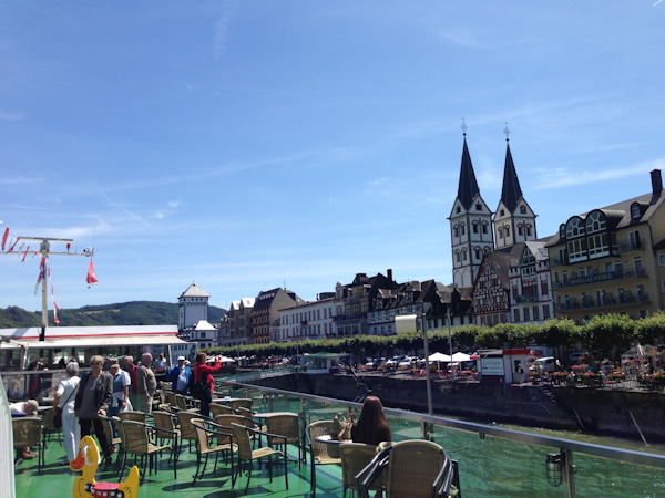 We have been looking forward to a day without the car, so we walked the mile or so into Bacharach from our hotel. There we boarded a river tour boat for a cruise to Boppard, about 1 1/2 hours north, passing through one of the most scenic stretches of the Rhine. The weather couldn’t have been better. We passed several of the long-haul river cruise ships, with their staterooms and huge picture windows, as we went. Most of the people got off our boat about halfway at St. Goar; it appeared that many of these were part of groups from tour buses.