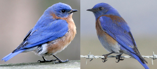Photo credits: Eastern Bluebird–male by Flickr user Patrick Coin and western bluebird male by Flickr user Devra used under Creative Commons license.