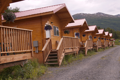 Our lodging for the night is the Knik River Lodge, south of Palmer and about an hour’s drive from Anchorage. Despite its relative proximity to Anchorage, you would think we are out in the middle of nowhere: it’s very quiet and secluded. The rooms are individual cabins on a hillside overlooking the Knik River Valley. Dinner was very delicious and served in a large circular tent (a yurt). We were happy to reconnect with a group from the Netherlands that we had encountered in Kennecott earlier in the trip.
